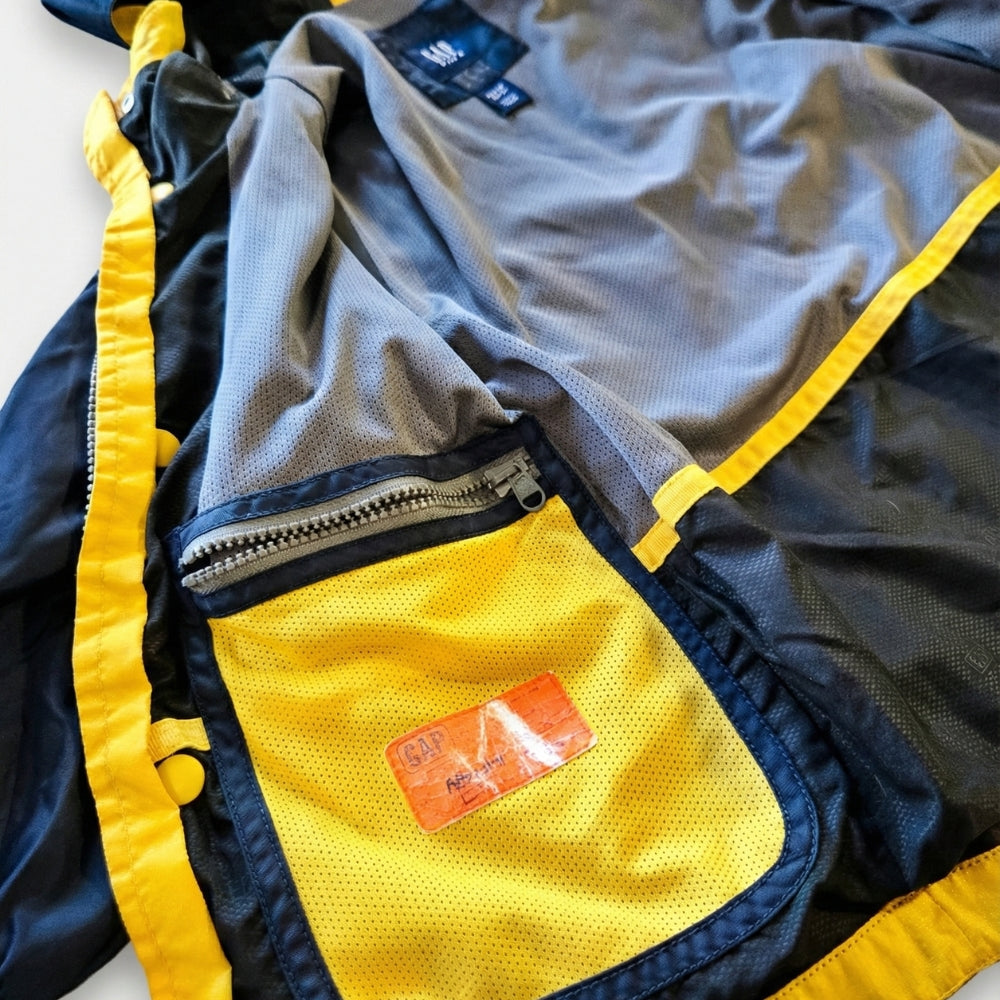 Designed for active days, it features a water-resistant shell to keep the elements at bay, while the breathable mesh lining ensures your little one stays comfortable without overheating. The cheerful yellow accents against the classic navy blue give it a pop of brightness, making it easy to spot on the playground. Thoughtful details like the snap-button storm flap and durable zipper add extra protection against the wind.