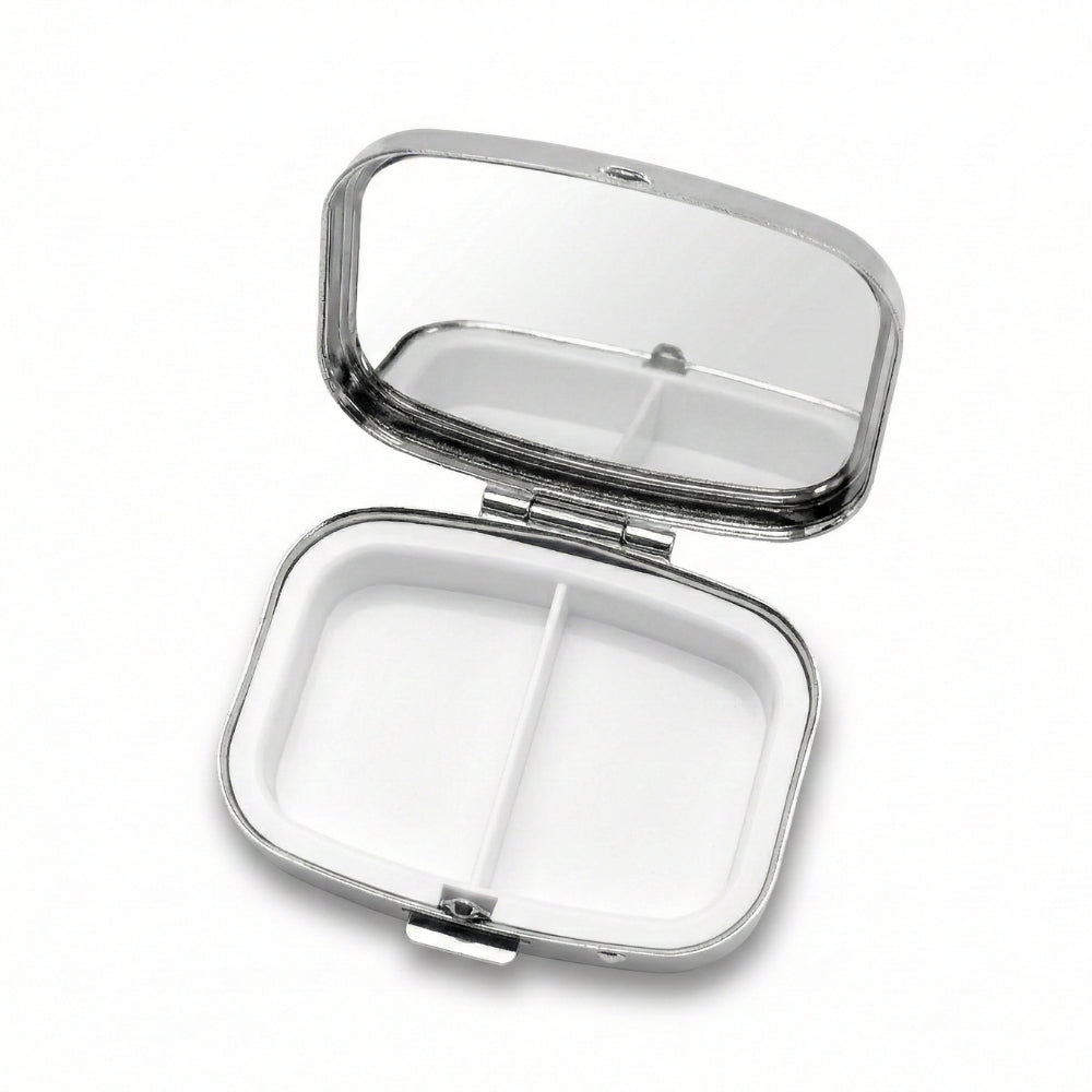 Beneath the conversation-starting exterior lies a highly functional travel case. The sturdy metal shell opens with a push-button latch to reveal a two-compartment plastic divider, perfect for keeping your morning and evening meds—or your mints and ibuprofen—organized. The lid features a built-in mirror, making it a handy compact for quick checks on the go.