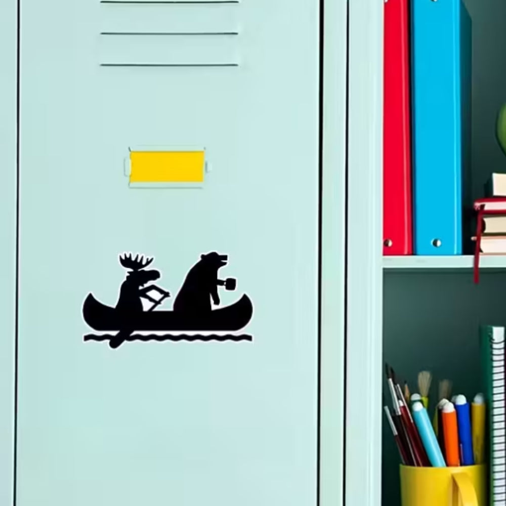 This isn't just any carpool; it's the ultimate Northern commute. Featuring the iconic silhouettes of a moose expertly paddling a canoe while a bear calmly enjoys a cuppa (or maybe a maple-syrup-infused coffee), this sticker captures the relaxed, wild spirit of Canada.