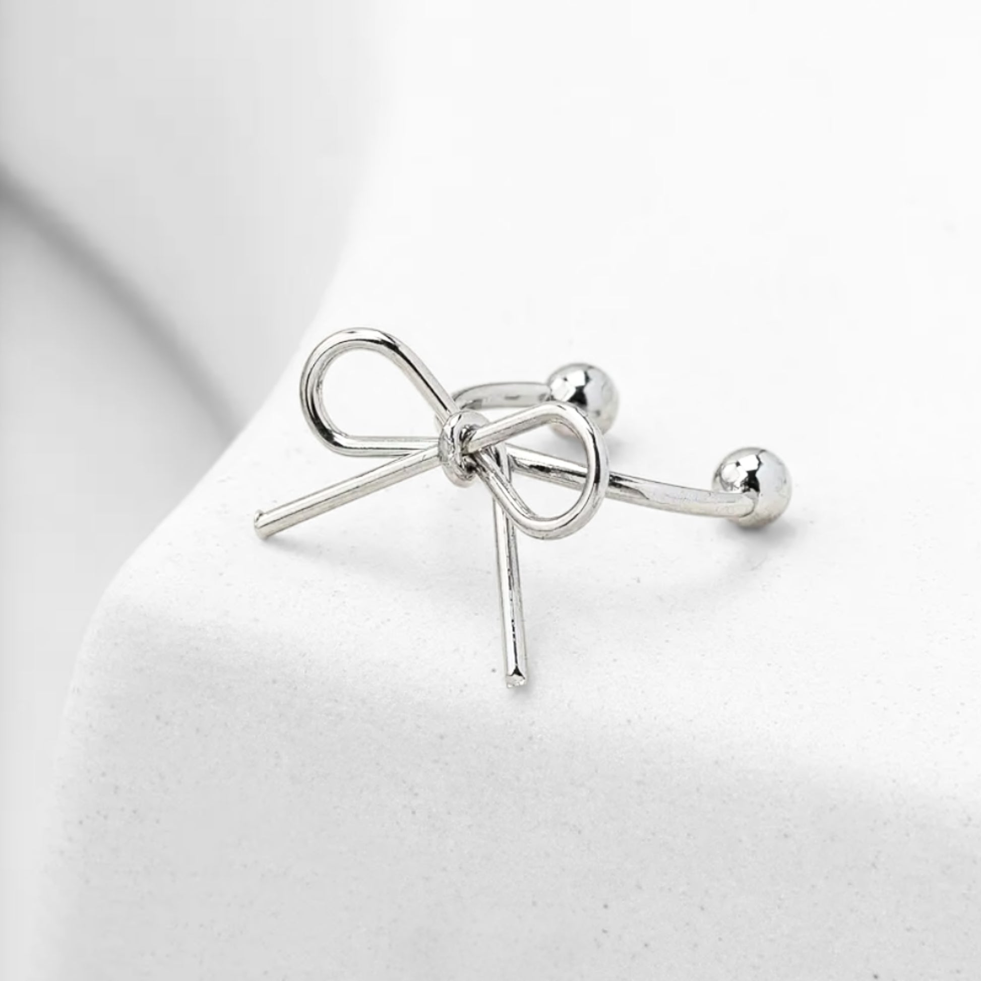 Add a touch of elegant charm to your ear without needing a piercing! This sweet Dainty Bow Ear Cuff features a delicate, open-loop design shaped like a perfectly tied bow, crafted in a lustrous silver tone. It gently clasps onto the cartilage of your ear, offering a chic and comfortable accessory. Perfect for achieving a stacked or minimalist look, this ear cuff brings a subtle playfulness and sophistication to any ensemble.