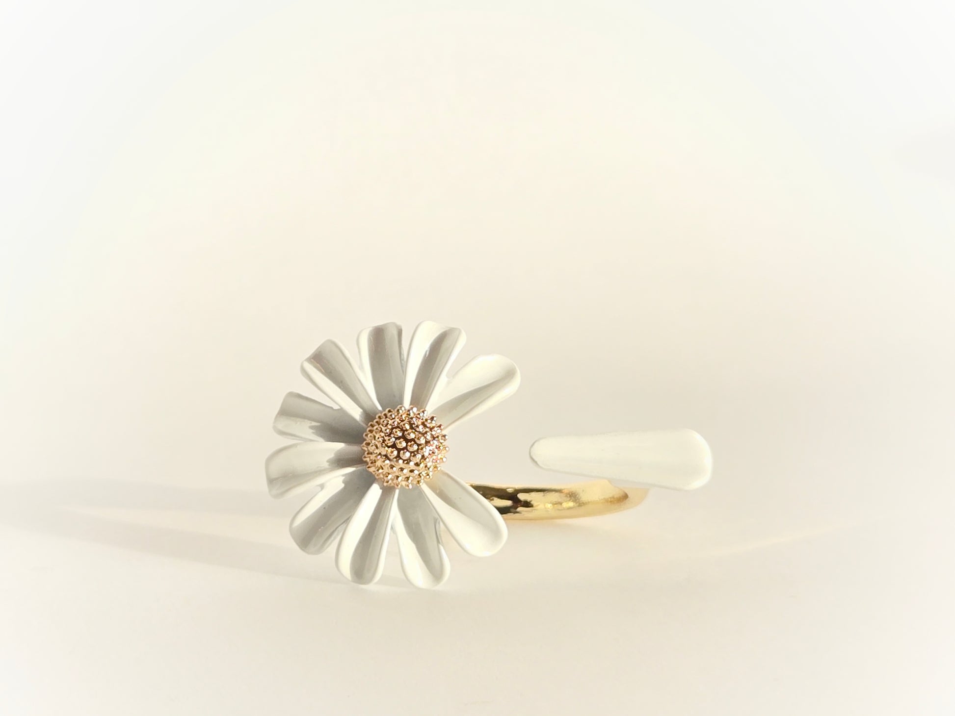 Our Daisy Petal Open Ring is delicately crafted with an intricate white daisy design, this gold ring radiates an aura of elegance, sophistication, and a touch of whimsy.