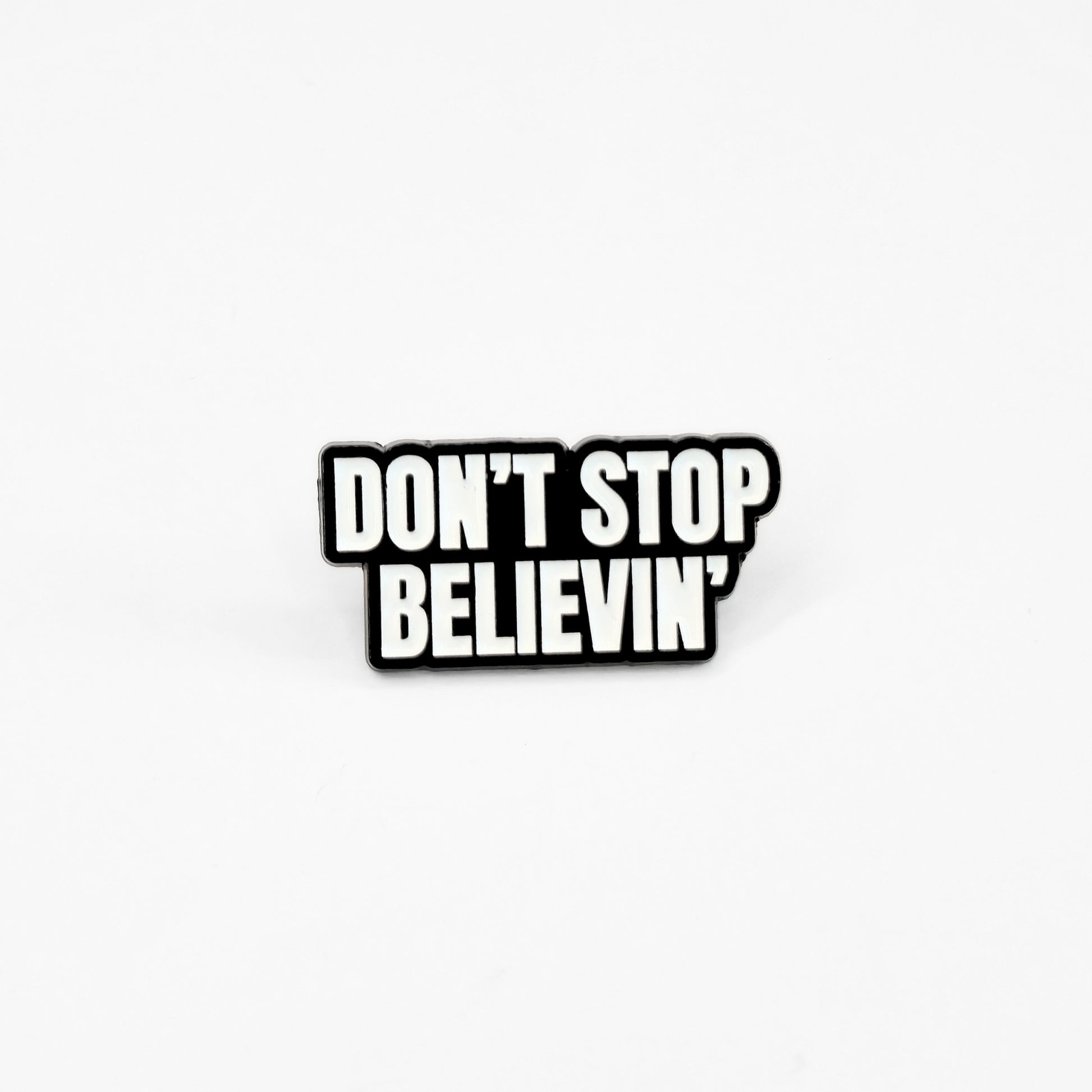 Carry a bit of iconic inspiration wherever you go! This bold enamel pin features the classic, uplifting lyric "DON'T STOP BELIEVIN'" in crisp white block lettering with a sleek black outline. It's a timeless reminder to hold onto hope, chase your dreams, and keep that inner fire alive. Perfect for adding a touch of nostalgic motivation to your denim jacket, backpack, or favourite band tee.