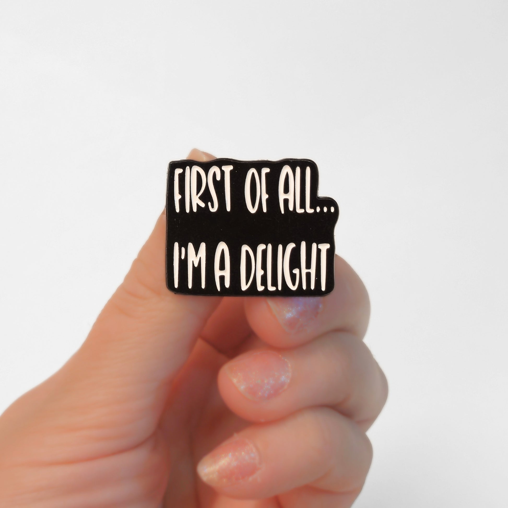 Command attention and radiate confidence with our "First of All... I'm a Delight" enamel pin! This sleek, black pin features a bold and unapologetically charming statement in crisp white, playful lettering. It's the perfect accessory to add a touch of sass and self-assuredness to any outfit, letting everyone know your true, delightful nature from the get-go.
