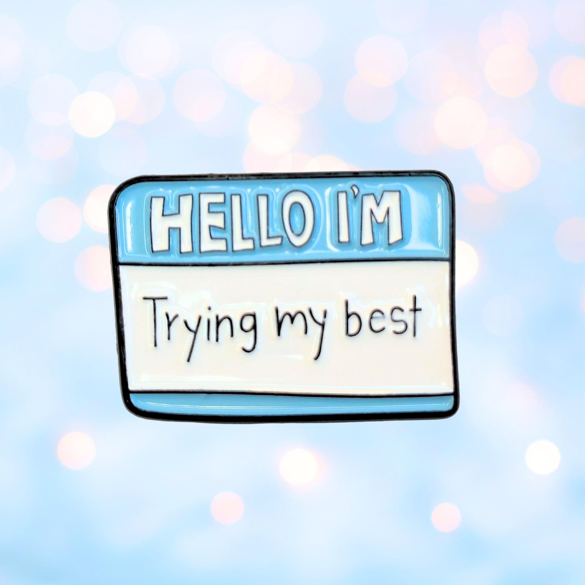 An honest and relatable introduction for every single day! This charming enamel pin is designed like a classic name tag, featuring a comforting light blue top half with "HELLO I'M" and a crisp white bottom half with the candid confession: "Trying my best." It's the perfect, understated way to communicate your efforts and find solidarity with others navigating life's demands. Pin it on your jacket, backpack, or even your work lanyard as a personal badge of perseverance.