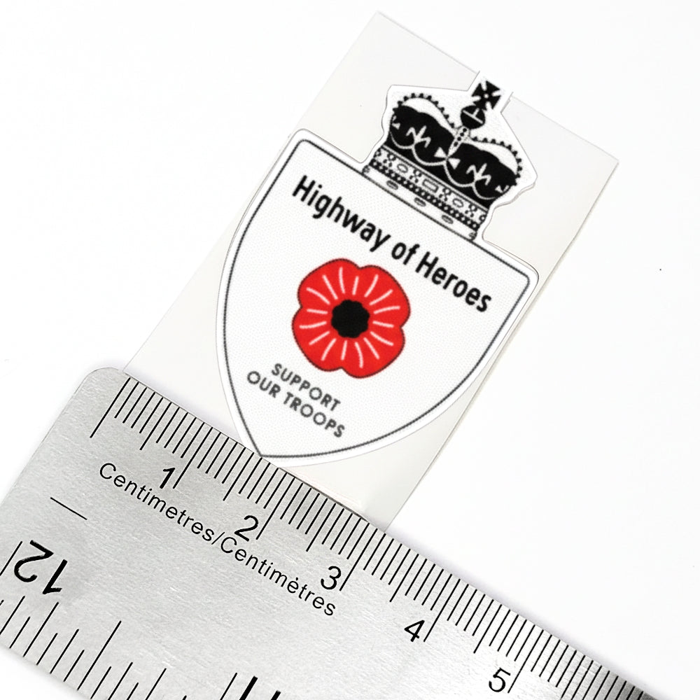 At the center of the shield is a large Remembrance Poppy, symbolizing sacrifice, with the text "Highway of Heroes" across the top and "Support Our Troops" below. It is a powerful symbol of Canadian respect for fallen soldiers and the military community.
