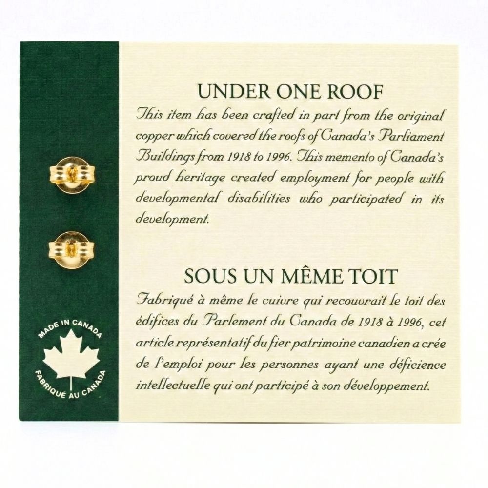 Wear a piece of Canada's story with these distinct stud earrings, featuring authentic copper reclaimed from the roofs of the Parliament Buildings in Ottawa. This copper sheltered the nation's capital from 1918 to 1996 before being carefully preserved and repurposed.