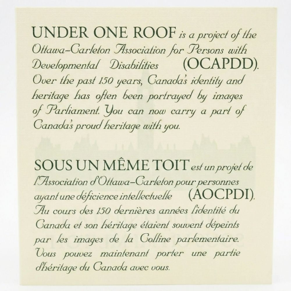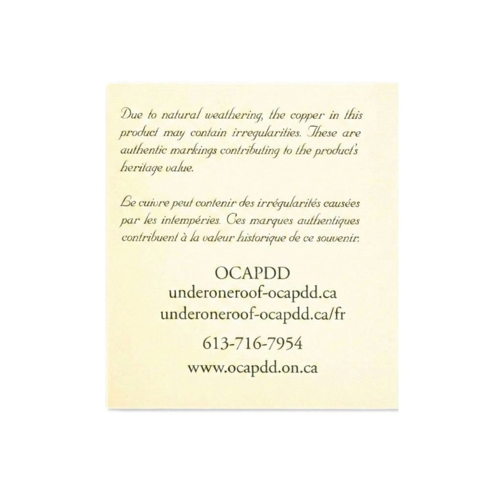 Combining movement and history, these dangle earrings feature the iconic Parliament copper suspended in a fine Sterling Silver setting. The copper inlay is sourced directly from the original roof of Canada's Parliament Buildings, which stood guard over Ottawa for nearly 80 years before being replaced. Created by Under One Roof (OCAPDD), these earrings represent a partnership between heritage preservation and social good, with proceeds supporting meaningful employment for adults with developmental disabilities.