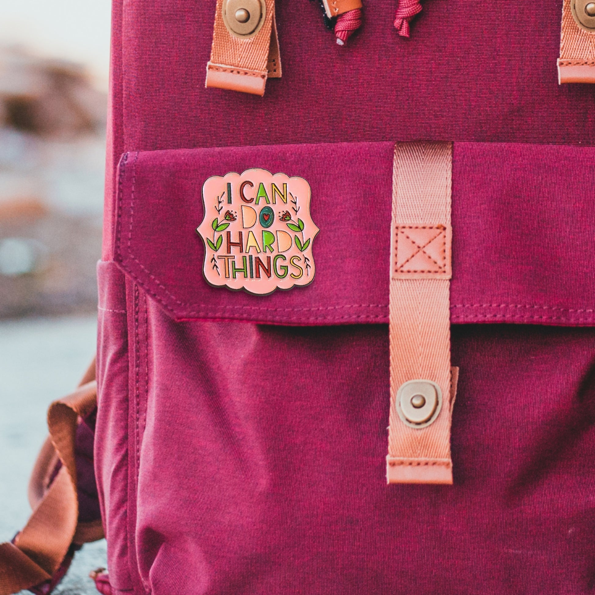 Boost your inner strength with this empowering "I Can Do Hard Things" enamel pin! Featuring a beautiful, ornate design with vibrant, multi-coloured lettering on a soft pink background, adorned with delicate floral and vine accents, it's a constant reminder of your resilience. This lovely pin is perfect for adding a splash of determination and style to your jacket, backpack, or favourite tote.