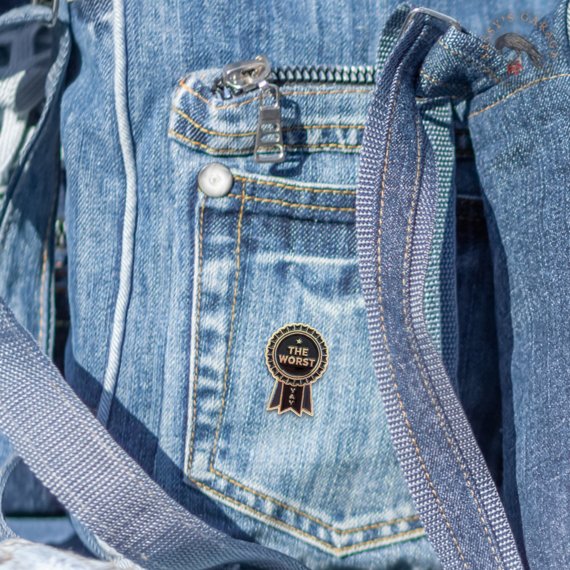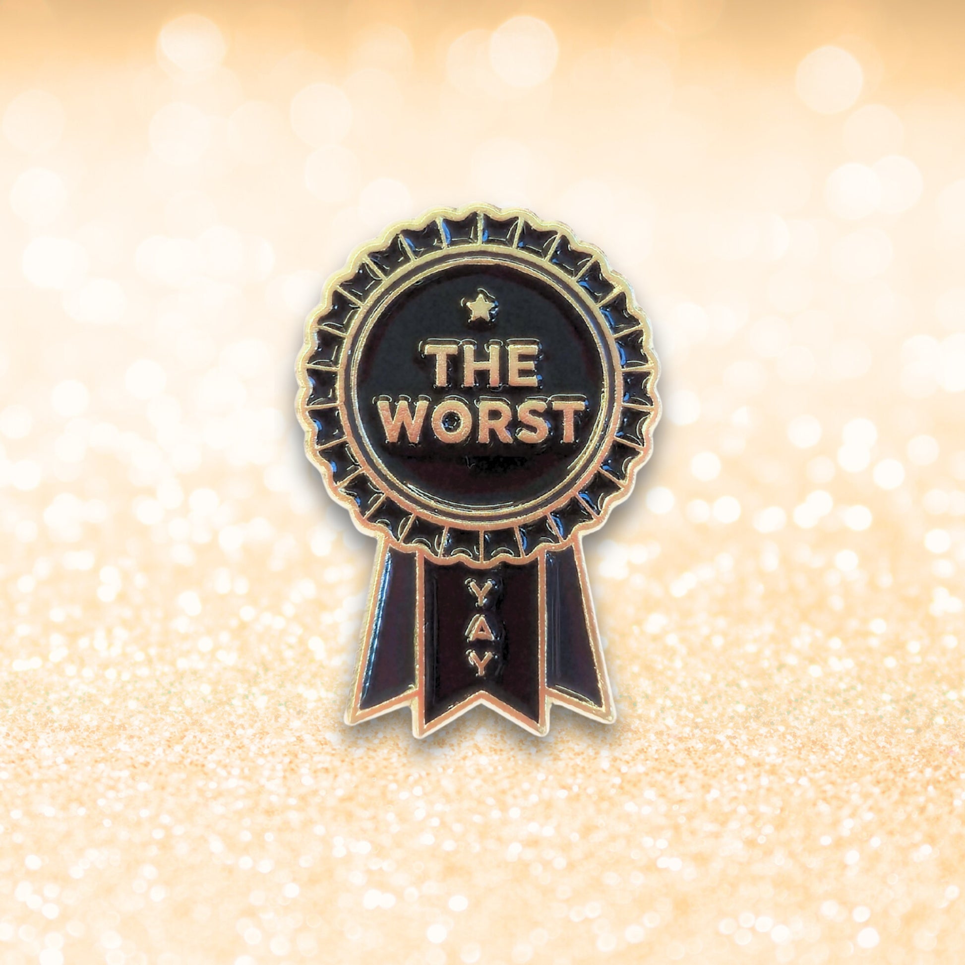 Celebrate your inner anti-hero with our "THE WORST" award ribbon enamel pin! This darkly humorous pin playfully inverts traditional accolades, featuring a classic black and gold award ribbon design with the bold text "THE WORST" prominently displayed. Below, a small "YAY" adds a touch of sarcastic triumph. It's the perfect accessory for those who appreciate witty irony and aren't afraid to embrace their perfectly imperfect self.