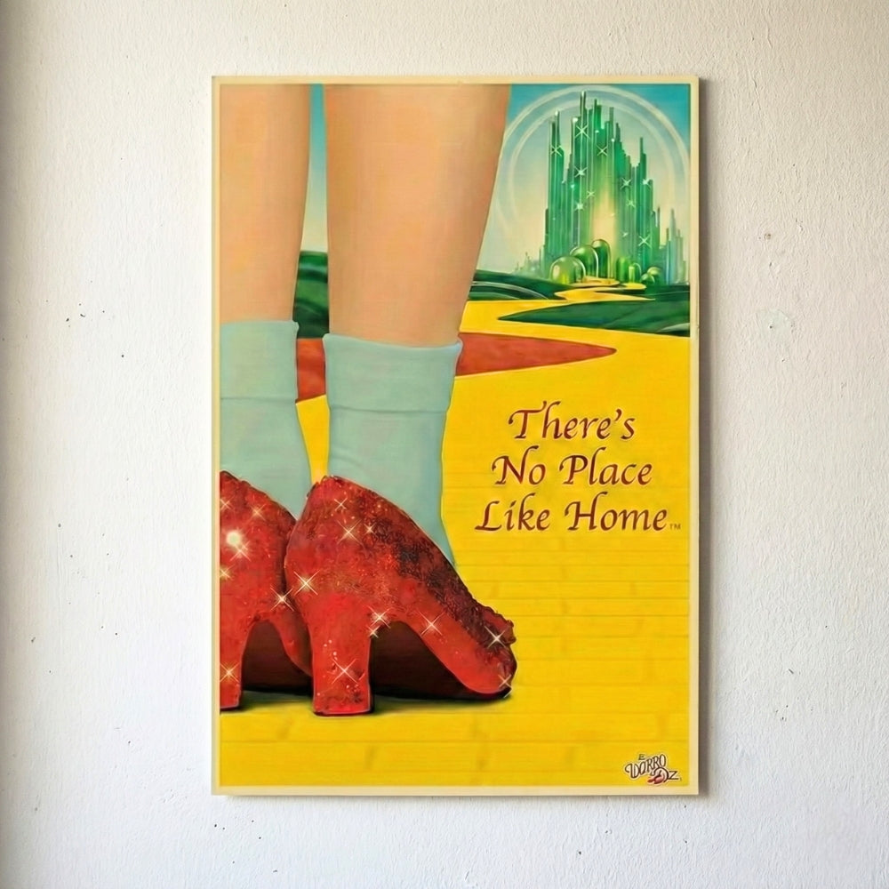 Step into a world of timeless magic and cinematic nostalgia with this stunning tribute to The Wizard of Oz. Capturing the iconic moment of Dorothy’s journey, this print features the legendary ruby slippers sparkling against the yellow brick road, leading the eye toward the majestic, glowing Emerald City in the distance. It is a heartwarming reminder that no matter how far you roam, the comfort and love of home are always the ultimate destination. This piece is perfect for dreamers, classic movie buffs, or anyone wanting to add a touch of fairytale wonder to their living space.
