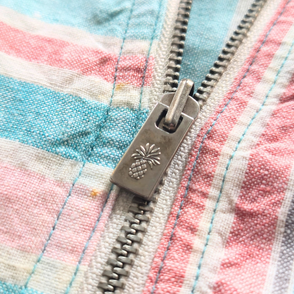 Features: Sleeveless, V-neck with partial zipper, unique copyrighted striped patchwork print, pineapple detail on zipper pull.