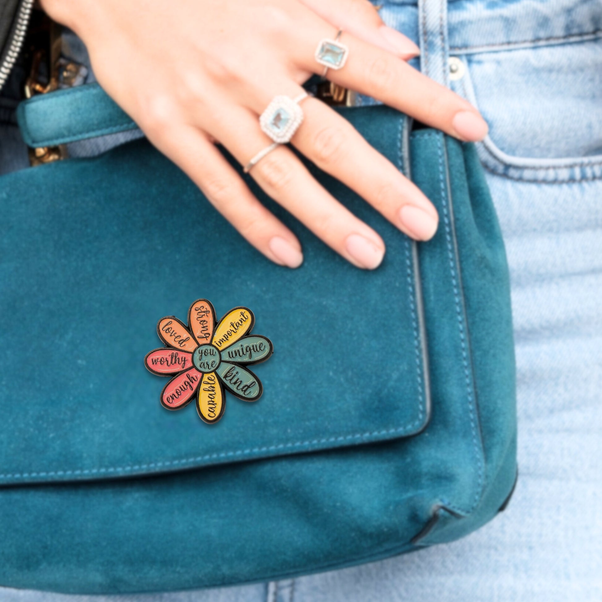 Celebrate all the wonderful parts of you! Our "You Are Strong, Loved, Worthy, Enough, Capable, Unique, Kind, Important" enamel pin is a beautiful, multi-petaled flower design. Each petal features a different empowering word in elegant black script, reminding you of your inherent value and strengths.